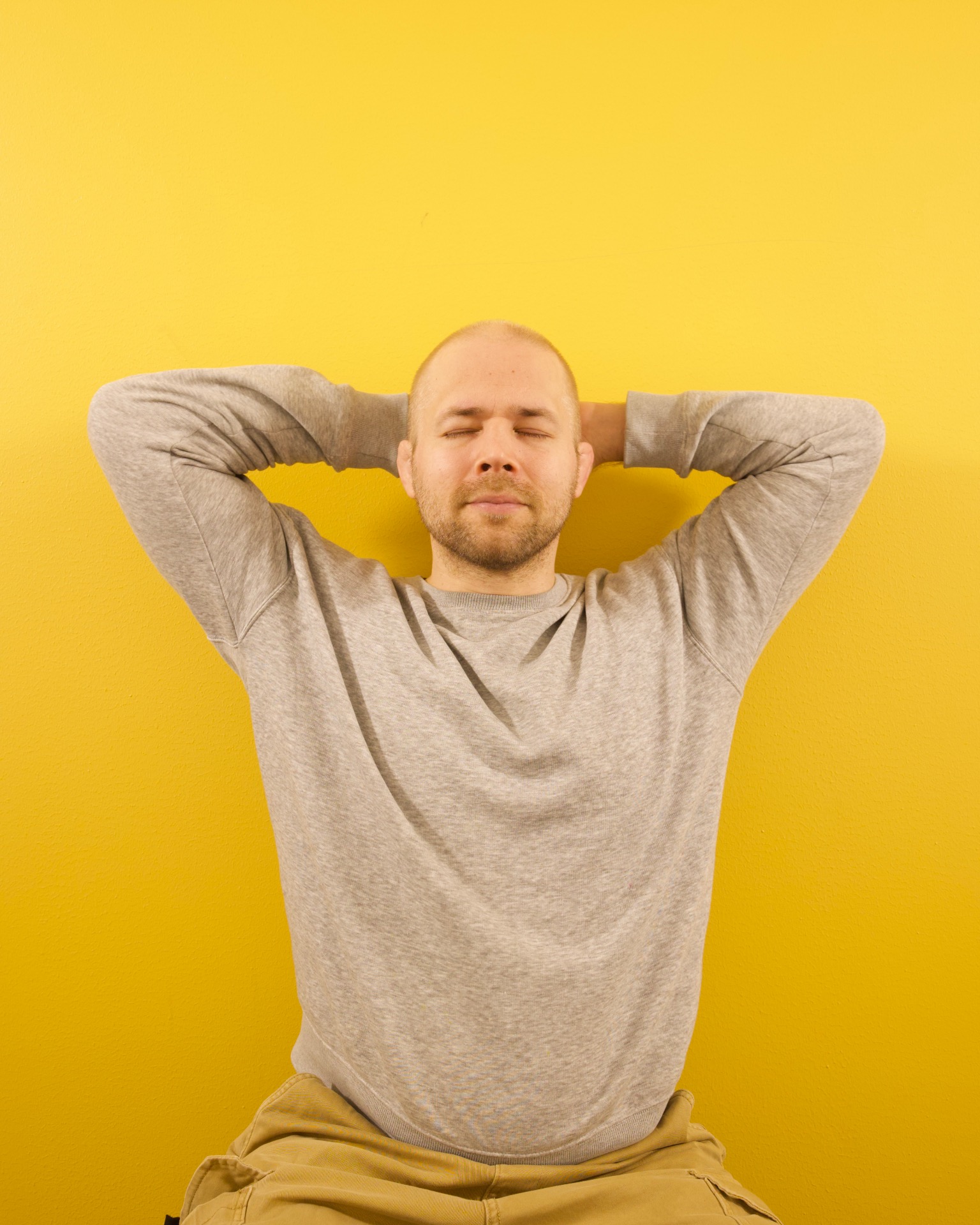 - Asetu selälleen ja laita sormet ristiin pään alle. Voit myös tehdä harjoitteen istuen, mutta selällään se on aluksi helpompaa.